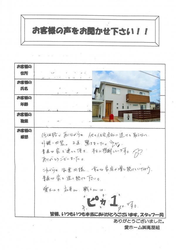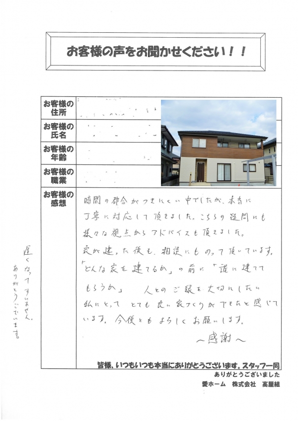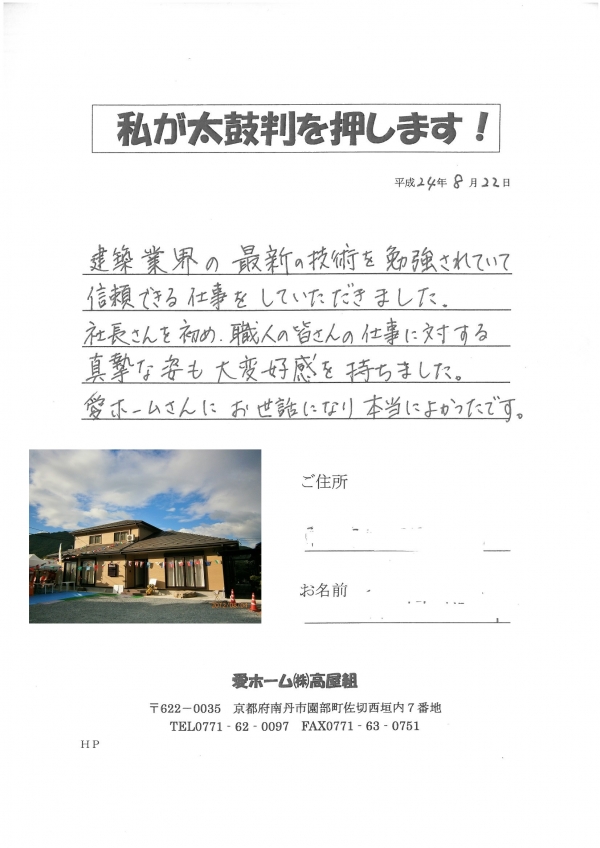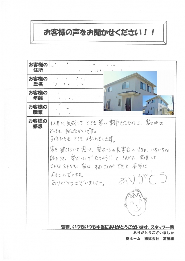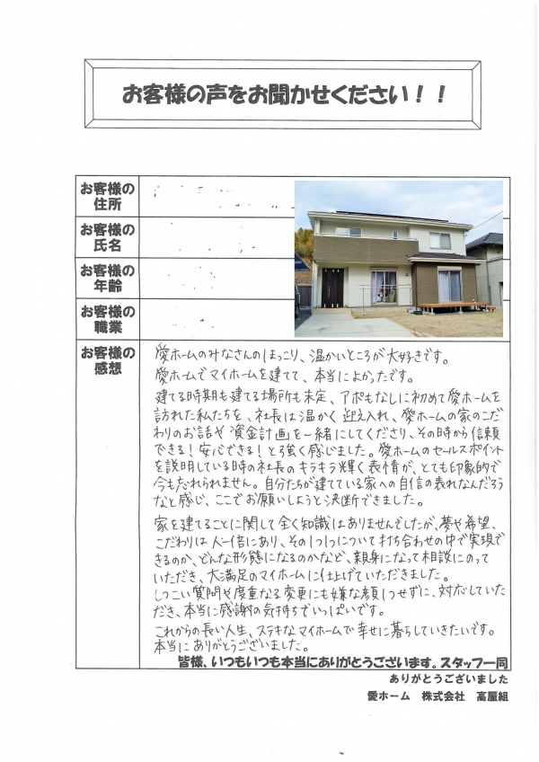 京都府南丹市S様邸愛ホームのみなさんのほっこり、温かいところが大好きです。愛ホームでマイホームを建てて、本当によかったです。建てる時期も建てる場所も未定、アポもなしに初めて愛ホームを訪れた私たちを、社長は温かく迎え入れ、愛ホームの家のこだわりのお話や資金計画を一緒にしてくださり、その時から信頼できる!安心できる!と強く感じました。愛ホームのセールスポイントを説明している時の社長のキラキラ輝く表情が、とても印象的で今も忘れられません。自分たちが建てている家への自信の表れなんだろうなと感じ、ここでお願いしようと決断できました。家を建てることに関して全く知識はありませんでしたが、夢や希望、こだわりは人一倍にあり、その1つ1つについて打ち合わせの中で実現できるのか、どんな形態になるのかなど、親身になって相談にのっていただき、大満足のマイホームに仕上げていただきました。しつこい質問や度重なる変更にも嫌な顔1つせずに、対応していただき、本当に感謝の気持ちでいっぱいです。これからの長い人生、ステキなマイホームで幸せに暮らしていきたいです。本当にありがとうございました。 |