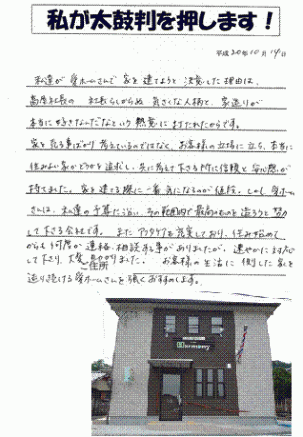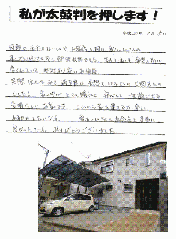 京都府南丹市 Y様邸私たちが愛ホームさんで家を建てようと決意した理由は、高屋社長の社長らしからぬ気さくな人柄と、家造りが本当にすきなのだなという熱意に打たれたからです。家を売るこ事ばかり考えているのではなく、お客様の立場にたち本当にすみよい家かどうかを追求し、共に考えて下さる所に信頼と安心感が持てました。家を建てる際に一番気になるのが値段。しかし愛ホームさんは私達の予算に沿いその範囲内で最高のものを造ろうと努力して下さる会社です。またアフターケアも充実しており住み始めてからも何度か連絡相談することがありましたが速やかに対応して下さり大変助かりました。お客様の生活に側した家を造り続ける愛ホームさんを強くおすすめします。 |